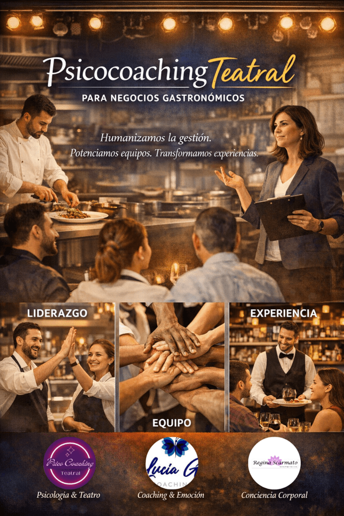 Psicocoachingteatral es un método innovador que integra psicología, coaching, herramientas teatrales, conciencia corporal y emocional, aplicado específicamente a la dinámica real de los negocios gastronómicos.